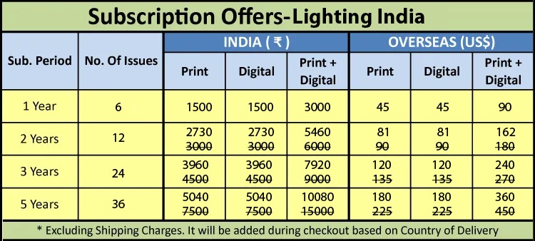 Lighting India – the only magazine of its kind covering the lighting industry in India as well as globally. Lighting India covers latest trends, innovations, technological finds, product reviews on Lighting Design, Automotive Lighting, Stage Lighting, Festive Lighting & Wedding Lighting, LED Signage & Displays, LEDs, Solid-state lighting, Drivers, energy efficiency, Industrial Lighting, Emergency Lighting, Security Lighting, Smart Lighting & IoT, Smart Home Lighting Solutions, IoT Lighting, Controls, Street Lighting, Heritage & Landscape Lighting, Heritage Buildings & Monuments Lighting, Garden Lighting, Horticulture Lighting, Architectural Lighting, Smart City Lighting, Residential Lighting, Commercial Lighting, Healthcare Lighting etc.